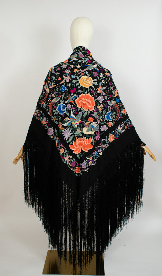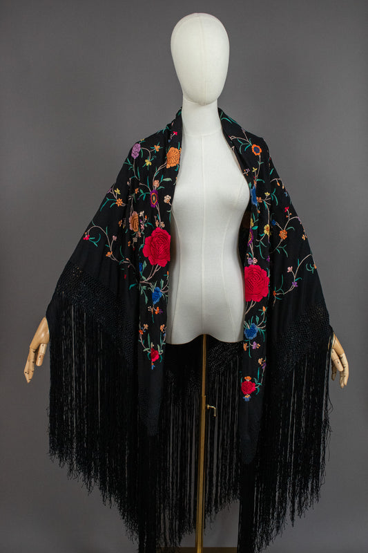 Vintage Embroidered Flowers & Vines Black Silk Canton Piano Fringed Shawl