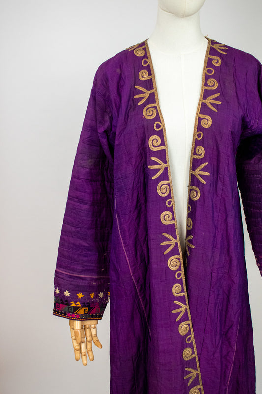 Vintage Rare Afghan XL Traditional Silk Embroidered Turkmen Chapan Purple Coat