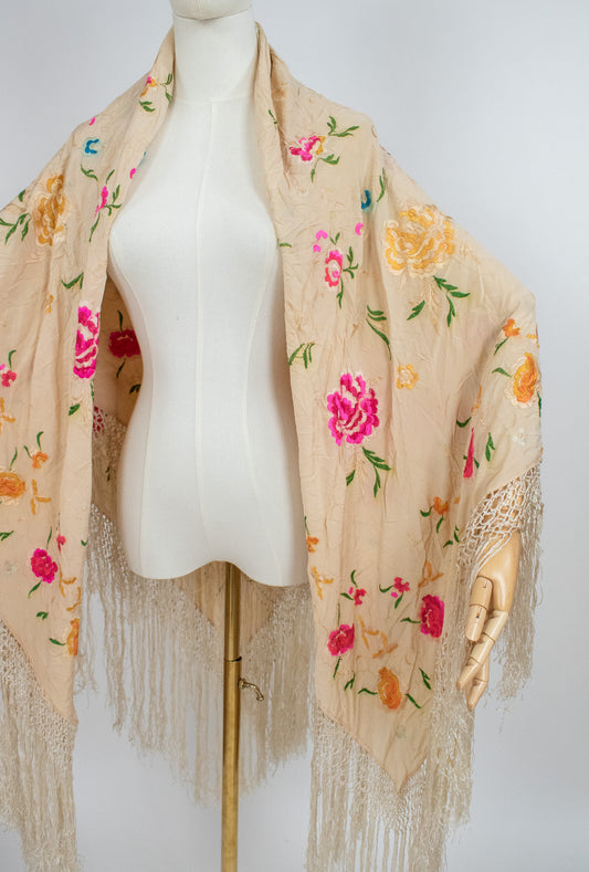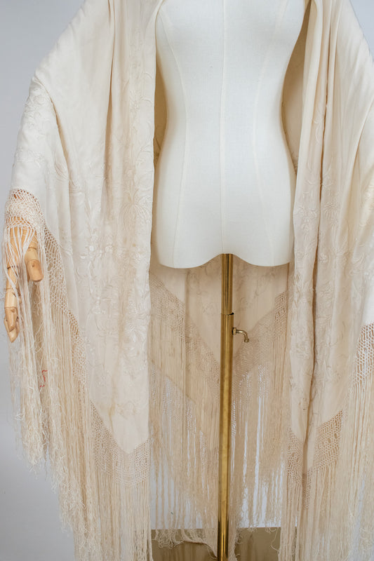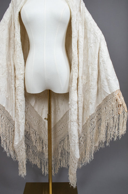 Vintage 1920s Ivory Silk Canton Floral Embroidered Piano Fringed Shawl