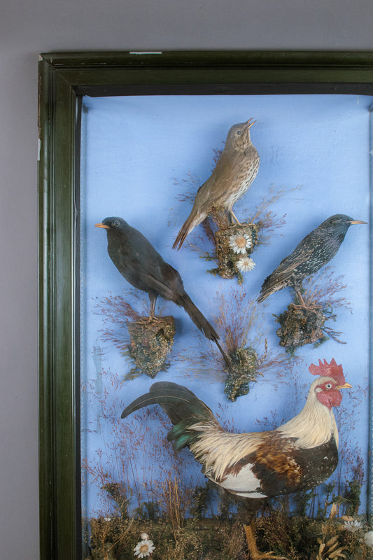 A Large Victorian Taxidermy Wall Cased Diorama Arrangement Bantam Cockerel & Garden Birds by George Bazeley of Northampton