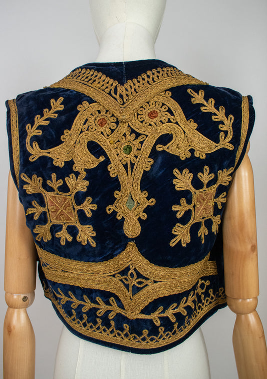 Vintage Afghan Ottoman 1960s Blue Velvet Embroidered Vest Waistcoat